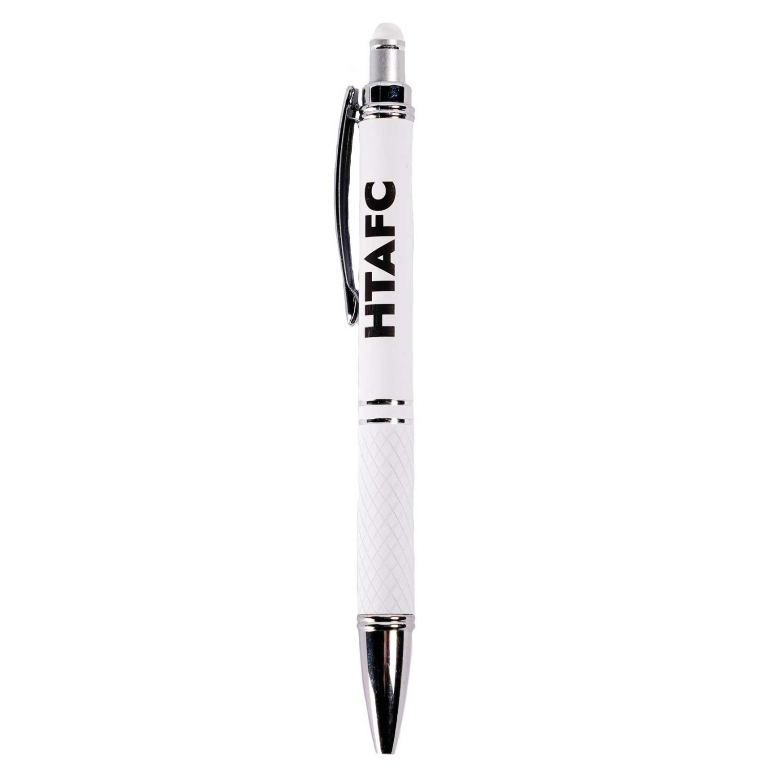 Get elegant styling with this HTAFC pen featuring chrome accents, a stylus for use on touchscreens, and a diamond-patterned grip.
